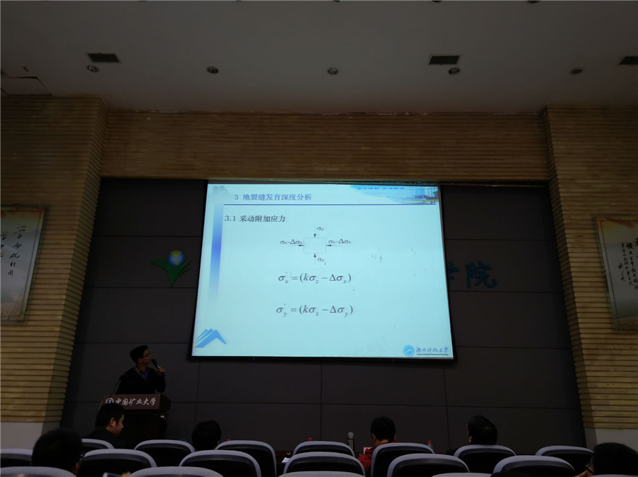 本次论坛共进行了学术报告71场,中国工程院院士袁亮教授作了题为“煤炭精准开采科学构想”的特邀报告,中国矿业大学党委副书记、纪委书记才庆祥教授作了“大型露天煤矿时效边坡理论及其分析方法”的专题讲座。我院博士生袁超、周泽分别作了题为《深部大变形巷道围岩破坏与稳定性控制方法》、《采动作用下浅埋岩溶洞塌陷机理分析》的学术报告。